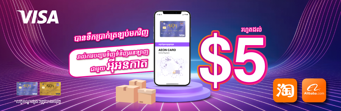 ទទួលបានទឹកប្រាក់ត្រឡប់វិញរហូតដល់ 5 ដុល្លារទូទាត់តាមអ៉ីអនកាតជាមួយកម្មវិធី Taobao or Alibaba